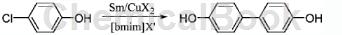 4,4′-联二酚制备如下:向干燥的反应容器中依次加入3g新制的金属钐粉,无水氯化铜0.26g,磁力搅拌。然后依次加入对氯酚3.4g,10ml预先除水干燥的氯代丁基甲基咪唑。反应在室温下进行,反应混合液3h内颜色变深,继续反应8h。反应液用萃取,经后处理得4,4′-联二酚粗产物。然后进一步柱色谱分离并通过重结晶纯化,得到4,4′-联二酚,产率87%。白色固体,熔点280-284℃.1hnmr(500mhz,cdcl3)δppm8.32(s,2h),7.41(d,j=8.8hz,4h),6.89(d,j=8.4hz,4h).在提取后的残液中加入二氯甲烷,通过搅拌、静置、转移、合并,蒸发回收溶剂后,获得回收的离子液体。