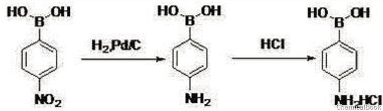 第二步,将63.7g4‑硝基硼酸(0.38mol,1eq)溶解到255g中,加入2.0g钯碳(10%,0.005eq),0.8~1.0mpa,70~80℃加氢反应6h,反应结束,使用硅藻土过滤,滤液降温至0℃,滴加51.0g浓盐酸(30%,0.38mol,1.1eq),0~10℃搅拌0.5h,过滤,滤饼使用80g丙酮打浆得到52.4g类白色固体4‑氨基硼酸盐酸盐,hplc:98.2%,第二步收率79.2%,总收率60.4%。