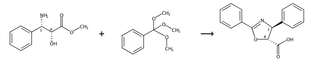 将(2r,3s)-3-基异丝氨酸(2.87g,0.013mol)溶于50ml的干燥中,将温度提高到110℃,然后再加入原甲酸三甲酯(5ml,0.029mol),反应8小时后,tlc跟踪原料完全消失。减压蒸除溶剂,初产物经柱层析慢速分离(薄层层析硅胶,石油醚:=8:1)得白色产物(4s,5r)-2,4-二基噁唑-5-甲酸甲酯,产率为66%。1h nmr(200mhz):δh 3.90(3h s),4.96(1h,d,j=6.5hz,),5.50(1h,d,j=6.5hz,),7.30-7.62(8h,m),8.10-8.20(2h,m);13c nmr(cdcl3,50mhz):δc 52.68,74.59,83.07,126.39,126.72,127.97,128.15,128.22,128.39,128.64,128.79,131.86,141.04,163.89,170.55.
