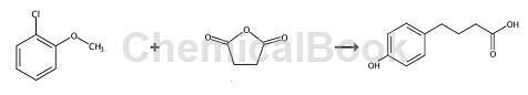 4-(3-氯-4-甲氧基基)-4-氧代丁酸(131):将alcl3(7.78g,57.4mmol)在ch2cl2(47ml)中的溶液冷却至0℃,在15分钟内逐滴将2-氯甲醚(5.00g,35.0mmol)的硝基甲烷(3.2ml)滴入上述体系,溶液加热至室温,用琥珀酸酐(2.34g,23.3mmol)在0.5小时内分批处理。将反应混合物回流加热8小时, hcl(g)排出,冷却至室温,倒入快速搅拌的冰(25g),2n h3po4(250ml)和ch 2cl2(250ml)混合物淬灭。形成沉淀,将悬浮液搅拌6小时,沉淀物溶解,用ch2 cl 2萃取含水混合物,用水,盐水洗涤,干燥(mgso4),过滤并减压浓缩。通过sio2(1:19,meoh:ch2cl2)上的柱色谱法纯化,得到5.27g(93%)131,为白色固体:rf = 0.27(10:90,meoh:ch2cl2);熔点184℃(ch2cl2)。