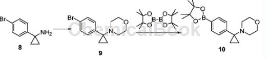 将1-(4-溴)环丙胺(1.70g,8.015mmol)溶于n,n-二甲基甲酰胺(20ml),置于封管中,加入2,2'-二溴二(1.4ml,8.816mmol)和n,n-二异丙基乙胺(2.7ml,16.03mmol)。反应加热至100℃,搅拌16小时。冷却至室温,加入,水洗,有机相经干燥、过滤和减压浓缩,粗品用柱层析分离纯化,得到中间体9(2.23g),收率42%。将中间体9(2.23g,7.902mmol),双联频哪醇硼酸酯(2.21g,8.692mmol),[1,1’-双(二基磷)二茂铁]二氯化钯(347mg,0.4741mmol)和醋酸钾(1.16g,11.85mmol)溶于1,4-二氧六环(30ml),加热至90℃,反应16小时。减压浓缩干,加入,盐水洗涤,干燥,过滤,浓缩后经柱层析(石油醚/=6:1,v/v)分离,得到化合物10(1.75g),收率67%。