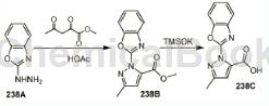 将化合物2 -肼基- 1 ,3 -并恶唑(1g,6.70mmol)和2,4-二氧代戊酸甲酯(966mg,6.70mmol)在acoh(5ml)中的混合物在120℃下搅拌16小时。 蒸发溶剂。 通过硅胶柱色谱法(石油醚:= 20:1-3:1)纯化粗产物,得到化合物238b(900mg,粗品),为灰白色固体。