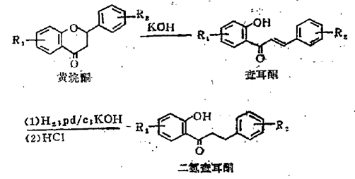 方法1:几乎所有的二氢查耳酮都是曲相应的查耳酮催化还原而来,而查耳酮则是由黄烷酮在碱作用下发生开环反应而得的。