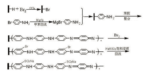 cn201110085742.5合成得到了聚胺/n‑型复合电极材料,发现所得到的电极材料具有良好的光电转化效应。聚胺/n‑型单晶硅复合材料,为磺化聚胺体系通过环上的c原子与单 晶硅表面的si原子以si‑c共价键的形式与单晶硅表面相连,在模拟太阳光的照射下,此复合材料的光电流密度值可以达到3.446ma·cm‑2,开路电压达到‑0.300v。制备方法是:首先利用对溴胺嫁接到单晶硅表面,然后以此为基底材料通过聚合反应制备聚胺/n‑型复合电极,并在聚合有机链的环上链接磺酸根,终得到磺酸修饰的聚胺/n‑型单晶硅复合材料。反应机理如下:
