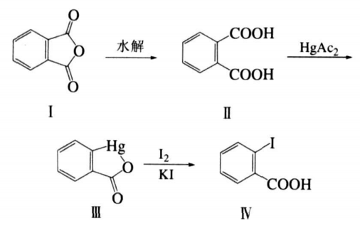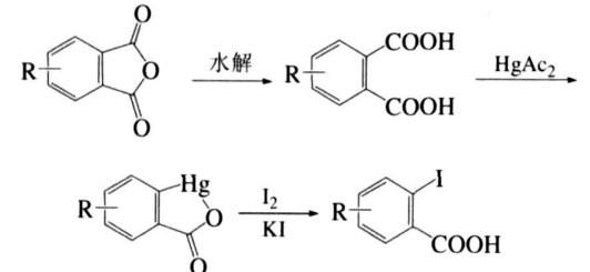 杨毅恒等设计并实施了另外一条合成路线,即直接以廉价的酐或酐衍生物为原料,经水解、汞代和碘代 3步反应便可合成出邻碘甲酸及其衍生物产品,产品的结构经熔点、1hnmr和ir表征得以证实。合成路线如下: