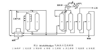 方法三mobil-badger 气相法[3],1976 年由m ob il 和 badger 公司合作开发了以高硅 zsm-5 沸石为催化剂制乙的气相法, 对和乙烯的烷基化反应及二乙和的烷基转移反应均具有较强的活性和良好的选择性。烷基化反应在高温、 中压的气相条件下进行, 反应温度 370~430℃,反应压力1. 42~2. 84 mpa, 乙烯质量空速3~5/h。