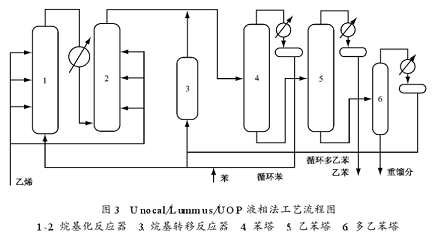 改良的alcl3法工艺流程与传统的alcl3法类似, 其差别在于烷基化和烷基转移反应是在两个反应器中进行。在改良的alcl3 法中, 仅仅是干燥的(而不是和循环的多乙) 与乙烯、 催化剂连续送入烷基化反应, 而烷基化反应的生成物和来自精馏塔的循环多乙混合后, 在另外一个反应器里进行烷基转移反应。