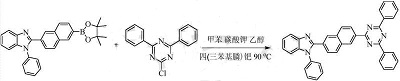 (b)在催化体系中,将步骤(a)的含有硼酸酯的产物分别与3-溴-1,10-菲罗啉或2-氯-4,6-二基-1,3,5-三嗪进行偶联反应,后续处理,分别得到两种结构的并咪唑化合物衍生物。所述含有硼酸酯的产物与3-溴-1,10-菲罗啉或2-氯-4,6-二基-1,3, 5-三嗪的摩尔比为1:(1~1.2)。