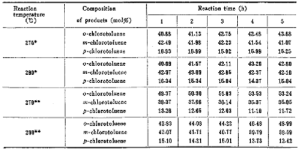 以邻氯为原料,对其进行异构化制备3-氯。用工业级的邻氯为反应原料,分析纯的和氯作为稀释剂,与邻氯按一定体积比混合均匀。钢瓶n2和h2作载气。异构化反应在石英管积分反应器中进行,催化剂用量7~8克。新鲜催化剂在空气中于500℃下活化1小时后,用n2降至反应温度,恒温后进料反应。原料用超微量泵输送,迅速气化的试样蒸气由载气连续带入催化剂床层,反应产物经冷凝按预定时间进行收集。催化剂(hzsm-5)结焦减活后,通空气在500℃下再生2小时,然后再用于反应。收集的液体产物用毛细管色谱仪分析。产物组成如下图所示。