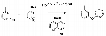 将3-氯、酚钠、氯化亚铜、8-羟基喹啉和聚二甘醇于反应容器中常温搅拌混合,并加热至混合液温度为130~140℃,然后保温搅拌反应8~9h,后经高真空减压蒸馏,取100~110℃馏分,即得间氧基,其反应方程式如下。该反应以酚钠和3-氯为原料在催化剂作用下一步反应制备间氧基,间氯既是反应物又是溶剂。