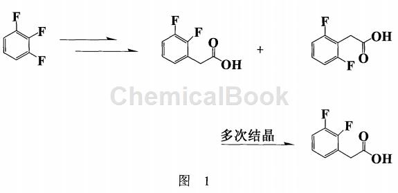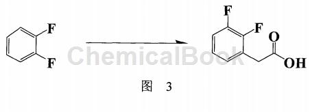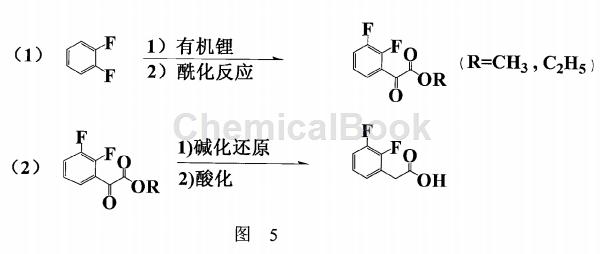 德国专利wo2008078350(图2)报导的以2,3-difluoro-mandelic aid为起始物经 酯化,氯化,还原,再碱解并酸化后制备2,3-二氟,由于步骤繁多,造成收率偏低(44.2%),而且起始物价格昂贵,也不适合工业化生产。