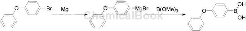 一种4-氧基基硼酸的制备方法,以4-溴二醚为原料,四氢呋喃为溶剂, 先与镁片反应制得格氏试剂,所得格氏试剂与硼酸三甲酯反应,再经盐酸水 解后制得4-氧基基硼酸粗品,后经纯化即得4-氧基基硼酸成品。具体包括下列步骤:
