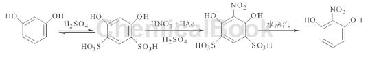 目前,2-硝基间二酚的制备方法主要有:方法1,以间二酚为原料直接用混酸硝化,由于酚羟基反应活性高,副产物多,收率仅为12.9 %;方法2,以间二酚为原料,先磺化用磺羧基保护4,6 位,再用硝酸和组成的混酸硝化后经水蒸汽蒸馏得到产物的收率为37.5 %