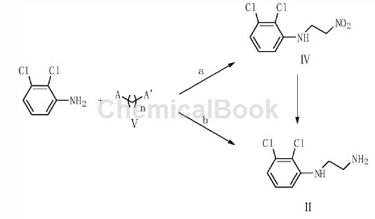 2,3-二氯胺是重要有机原料中间体,如合成阿立哌唑光降解杂质本发明所述的阿立哌唑光降解杂质。阿立哌唑(aripiprazole),化学名为7-[4-[4-(2,3-二氯基)-1-哌嗪基]丁氧基]-3,4-二氢-2(1h)-喹啉酮,由日本大冢制药株式会社研制,2002年11月在美国上市,属于第三代非典型抗精神病药物。阿立哌唑是种多巴胺系统稳定剂,对精神分裂症阳性和阴性症状均有显著疗效。。阿立哌唑用于治疗精神分裂症,能够显著改善这类精神分裂症状,但却没有其他抗精神病药常见的一些副作用,例如体重的增加和非自主性肌肉活动等。阿立哌唑光降解杂质是指在光照的条件下降解产生的杂质,其合成方法为:以2,3-二氯胺为原料,与化合物ⅴ反应生成化合物ⅱ,化合物ⅱ与化合物ⅲ反应得到目标产物化合物i。所述化合物ⅴ中的a为cl、br、cooh、cho或cocl基团;a’为nh2或no2基团;n=1或2。所述的阿立哌唑光降解杂质的制备方法,其合成路线合理,原料易得,操作简单易行,所得目标产物的收率高,纯度高。