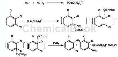 一种2,3-二氯胺/2,6-二氯胺的制备方法,该法的工艺路线利用二氯生产过程中副产物1,2,3-三氯做原料,氨解得到2,3-二氯胺/2,6-二氯胺,过程中加入催化量的催化剂和助催化剂,同时避免了三乙胺加入,具有工艺流程简单,成本低,“三废”少等优势。所述1,2,3-三氯氨解制备2,3-二氯胺/2,6-二氯胺过程属于亲核取代反应,由于三氯环上无强吸电子基团(如硝基、磺基或氰基),导致-cl不够活泼,另外氨解过程是油水两相反应,需要加入催化剂和助催化剂,在高压釜中一定温度压力条件下,进行催化氨解。技术方案是:将氨水、1,2,3-三氯按照一定比例投入反应釜中,控制合适的反应温度和压力,在催化剂和助催化剂作用下进行氨解反应,反应结束降温泄压,再将所得反应物进行分析和分离,得到2,3-二氯胺和2,6-二氯胺成品。所述氨水的浓度为10%-60%,优选30%-50%。所述1,2,3-三氯与氨的摩尔比1:6.0-30.0,优选1:8.0-16.0。所述氨解的催化剂为能与氨络合金属离子,如铜离子、锰离子、钴 离子等,优选金属铜离子,催化剂可以单独投加也可以预先溶解到氨水中投料。所述催化剂的用量为1,2,3-三氯摩尔量的0.1%-10%,优选 1.0%-5.0%。所述的助催化剂为相转移催化剂,用于改善有机相和氨水相间传质,提高氨解收率。相转移催化剂为季铵盐类和聚醚类,用量与催化剂重量比为1:1。所述反应温度为100℃-250℃,压力范围2.0-10.0mpa,优选150℃ -210℃,压力范围3.0-7.0mpa。所述氨解反应时间5-60h,优选10-50h。主反应方程式如下(以亚铜离子为例):