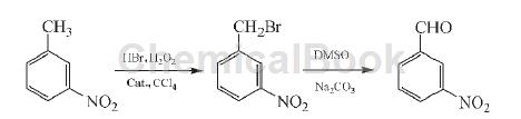 方法2:以间硝基为原料,以aibn (偶氮二异丁腈) 为催化剂合成间硝基甲醛。在n (间硝基) ∶n(氯溴酸) ∶n (双氧水)=1 ∶3 ∶3,溴化温度65~75℃,溴化时间8~9 h,氧化水解间在8 h 的优化条件下,产品收率30.4%,:纯度99.2%。