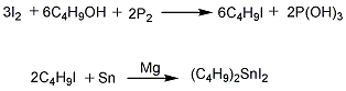 (1)二碘代二正丁基锡的制备 由碘、红磷、丁醇、锡粉、镁粉及盐酸、固碱而制得。具体操作方法见马来酸单丁酯二丁基锡的制法。