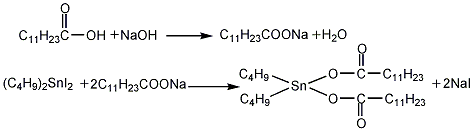 (2)成品的制备 将月桂酸(工业品)1mol加入反应釜,搅拌下升温至60℃,缓缓加入2.1mol烧碱配制成20%的溶液。碱液加完后,搅拌0.5~1h,升温至80~90℃,加入二碘代二正丁基锡1mol,保持80~90℃,反应1.5~2h。静置15~30min,碘化钠呈固体沉淀析出,经过滤回收后精制。分离出碘化钠的物料经减压蒸馏、冷却、压滤,即得成品。