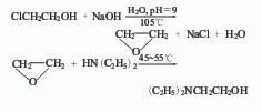 1.将氯乙醇与氢氧化钠在105℃下进行反应,生成环氧乙烷,通入二乙胺溶液中进行反应,在常压下分出低沸物后,减压分馏得n,n-二乙基乙醇胺成品。目前大部分生产厂直接用环氧乙烷作原料。