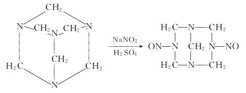 由六亚甲基四胺(乌洛托品)经亚硝化而得。将乌洛托品和亚硝酸钠用水溶解后,在搅拌下滴加稀(或稀盐酸),反应温度控制在0℃左右。亚硝化结束后补加少量氨水及亚硝酸钠。生成物经抽滤、洗涤、甩干、干燥、过筛即得成品。工业品发泡剂h纯度≥98%。原料消耗(kg/t)乌洛托品 720亚硝酸钠 1018(93%) 800氯水(20%) 650
