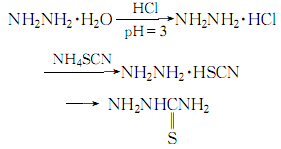 2.冷却条件下将31%~36%的盐酸加到30%的水合肼溶液中,使溶液ph值为3左右,在搅拌下加入过量的98%的硫氰化铵溶液,控制温度在30℃以下加入少量丙酮,加热回流4~5h,进行反应: