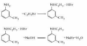 以间胺为原料,在反应釜中加热升温,在一定温度下滴加溴乙烷溶液,回流维持几小时后,再加碱液中和,分离后,经精馏而得成品。