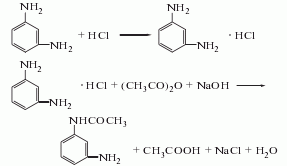 1、间二胺酰化法 由间二胺酰化而得。向反应锅中加入水及间二胺,使溶解。再加入30%盐酸,搅拌半小时,然后加入,控制反应温度在40℃,保温搅拌1h,加入精盐盐析,过滤。经中和得间氨基乙酰胺。酰化操作也可能采用乙酐作为原料。原料消耗定额间二胺1021kg/t、乙酐1013kg/t、盐酸475kg/t。