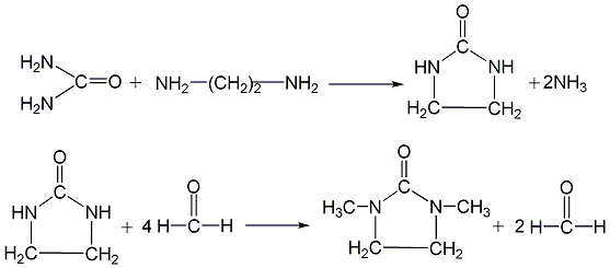 首先尿素与乙二胺在乙二醇溶液中进行合环反应生成2-咪唑啉酮,然后2-咪唑啉酮和甲醛及甲酸反应生成1,3-dmi。
