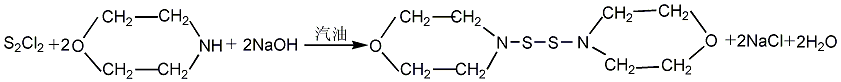 将吗啡啉、溶剂汽油(或和)及少量水加入反应釜,搅拌均匀后,将一氯化硫、汽油和氢氧化钠溶液同时滴加于釜内,控制温度在10℃以下,氢氧化钠溶液应稍前于一氯化碳滴加完。滴加完毕后,补加一定量水,继续搅拌30min。然后将反应物进行抽滤,滤液进行汽油与水相分离并回收汽油。滤饼加入离心机内用水洗涤至中性,脱去水后进行干燥处理即得成品。