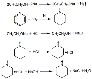 2.以吡啶为原料,经催化氢化而得。催化剂为兰尼镍,温度从50℃逐步升到200℃,压力高达5~7 mpa。通氢气至不吸收为止,反应液过滤,滤液蒸馏收集102~108℃馏分即为产品。