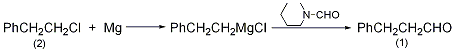 于装有搅拌器、温度计、回流冷凝器、通气导管的反应瓶中,加入镁屑2.88g(0.12mol),无水thp300ml,一粒碘。通入干燥的氮气。滴加由β-乙基氯(2)14.06g(0.1mol)溶于50mlthf的溶液,先加入约2ml温热引发反应。当反应引发后,慢慢滴加其余溶液,滴加速度以反应液微微回流为宜。加完后于23℃搅拌反应1h,而后回流反应8h。冷至0℃,慢慢滴加n-甲酰基哌啶13.56g(0.12mol)与干燥的盐酸酸化至ph2,分出有机层,水层用提取3次。合并有机层,依次用水、10%的碳酸氢钠、饱和食盐水洗涤,无水镁干燥,回流溶剂后减压分馏,收集约87℃/133pa的馏分,得3-基丙醛(1)8.8~10.2g,收率66%~76%。[1]