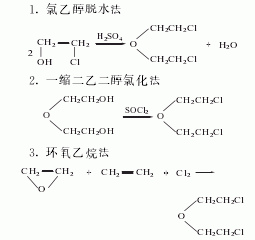 于装有搅拌器、温度计、滴液漏斗、回流冷凝器(安装气体导管至so2、hcl气体吸收瓶)的反应瓶中,加入β,β'-二羟基二(2)500g,冰盐浴冷至0℃,搅拌下慢慢滴加氯化亚砜1.2kg,控制温度不超过20℃,约4h加完。而后室温反应3h。放置过夜,加入吡啶5g,回流反应3h。冷却后,慢慢倒入冰水中,充分搅拌。静置分层。分出有机层,用饱和碳酸钠溶液洗涤至中性。无水磷酸钙干燥,减压蒸馏,收集55~60℃/1.0~1.2kpa的馏分,得β,β'-二氯二①(1),收率80%。注:①也可由氯乙醇在存在下加热脱水来制备。[26]