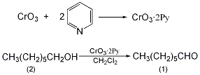 三氧化铬-吡啶的制备:于装有搅拌器、温度计、干燥管的干燥的反应瓶中,加入500ml无水吡啶①,冰水浴冷却至15℃,搅拌下于15min分批加入无水三氯化铬②68g(0.56mol),注意加入时反应液的温度不超过20℃。加入过程中析出深黄色絮状沉淀,且混合物的粘度增大。加完后继续搅拌下升至室温,1h内粘度减小,黄色产物为深红色结晶。静置,倾去吡啶,以无水石油洗涤三次。抽滤,石油醚洗涤,真空干燥,得三氧化铬-吡啶150~160g,置于棕色瓶中于0℃贮存。庚醛(1):于装有搅拌器的反应瓶中,加入无水二氯甲烷650ml,搅拌下室温加入三氧化铬-吡啶复合物77.5g(0.3mol),而后一次加入正庚醇(2)5.8g(0.05mol),约20min后,从不溶的棕色胶状物中倾出上清液,不溶的残渣用洗涤三次。合并二氯甲烷与层,依次用5%的氢氧化钠、5%的盐酸、饱和碳酸钠、饱和食盐水洗涤,无水镁干燥。蒸出溶剂后减压蒸馏,收集80~84℃/8.65kpa的馏分,得庚醛③(1)4~4.8g,收率70%~84%。注:①用固体氢氧化钾干燥后重蒸一次即可使用。②将三氧化铬于盛有五氧化二磷的真空干燥器中干燥后使用。③这是由醇制备醛的方法之一。用三氧化铬-吡啶复合物作氧化剂由醇制备醛的一般方法如下:首先配置5%的三氧化铬-吡啶的无水二氯甲烷溶液(深红色),使复合物与醇的摩尔比6:1。氧化剂过量是为了将醇完全氧化为醛。搅拌下于室温将醇一次加入到上述深红色溶液中,无立体阻碍的伯醇或仲醇于25℃在5~15min内即可完全反应,同时析出棕黑色的三氧化铬-吡啶的还原产物。将上清液倾出,沉淀用二氯甲烷充分洗涤。合并二氯甲烷溶液,依次用稀盐酸、碳酸氢钠、水等洗涤以除去吡啶和铬盐,或者直接用助滤剂过滤、或者用色谱柱分离,蒸出溶剂,即可得到相应的产物。[21]