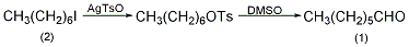 于装有搅拌器、温度计的反应瓶中,加入11g对甲基磺酸银①溶于100ml乙腈的溶液,冷至0~5℃,加入1-碘庚烷(2)7.0g(31mmol),避光室温搅拌反应过夜。将反应物倒入冰水中,提取。层干燥后指出溶剂,得到油状物。于另一反应瓶中加入碳酸氢钠20g,dmso150ml,通入氮气,使不断鼓泡。加入上述油状物,加热至150℃(有时冒烟)。3min后迅速冷至室温。将生成的醛与2,4-二硝基肼反应生成相应的腙,得到腙6.9g,收率70%,mp106~107℃。标准样品混合,混合熔点不变。注:①其制备方法为:将等摩尔的氧化银与对磺酸一水合物加入乙腈中,避光搅拌反应30min,过滤。蒸出乙腈,于65℃干燥,备用。[22]