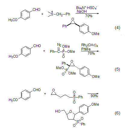 形成环氧乙烷衍生物 对甲氧基甲醛可以与硫叶立德反应,形成环氧乙烷衍生物 (式4)[7],也可以与重氮化合物反应得到此类衍生物 (式5)[8]。与环氧乙烷衍生物反应,还可以扩环得到呋喃环衍生物 (式6)[9]。