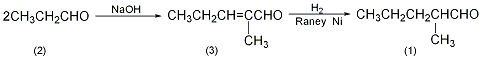 2-甲基-戊烯-2-醛(3):于装有搅拌器、温度计、滴液漏斗的反应瓶中,加入固体氢氧化钠20g(0.5mol),水650ml,水浴冷却。搅拌下于20℃滴加98%的丙醛1000g(16.9mol)。加完后升温至40℃保温反应20min。冷却至20℃以下,分出有机层,少量水洗涤后,常压蒸馏,收集125~140℃的馏分,得2-甲基-戊烯-2-醛(3)1520g,收率90%。2-甲基戊醛(1):于高压反应釜中加入上述化合物(3)1.5kg(15.3mol),ranney ni 催化剂100g,以氮气置换空气,再以氢气置换氮气。于100℃,1.3~1.5mpa压力下通氢,直至吸收氢气达到理论量或不再吸收氢时为止。冷却后放出残液。过滤,滤饼为ranney ni,可重复使用。滤液为2-甲基戊醛(1),重1220g,收率90%。[1]