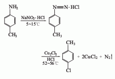 在反应釜中加入工业用盐酸和对甲基胺,釜内温度降至0℃,使对甲基胺生成盐酸盐,搅拌,加入亚硝酸钠溶液,使其发生重氮化反应,温度维持在0~5℃,时间约30min,重氮化反应完成后,将其加入到搅拌的氯化亚铜溶液中,逐渐升温到室温,在室温下搅拌2.5~3h,再加热到60℃,该反应物逐步分解成为氮气和对氯,然后用水蒸气蒸馏,收集对氯与水的混合液,进行分层,有机层用酸洗涤,再用水洗涤,干燥,进行蒸馏,收集158~162℃馏分为对氯,收率约70%~79%。