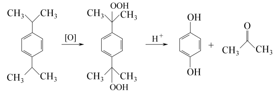 3.二异丙氧化法 利用过氧化物进行氧化反应,制得氢醌。其反应式如下: