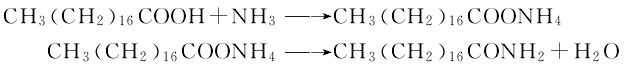 1.将1 mol硬脂酸投入反应釜加热熔融。在搅拌下继续升温至200 ℃,开始通入氨气。氨气从釜底通入,加快搅拌速度,加强气态与液态的接触。副产物水和未反应的氨气通过冷凝系统进入回收装置。当通入氨气相当硬脂酸质量份数的2倍时,取气样检验,如果气体中不再含有水,反应到终点。停止通氨,趁热出料加工成型。用乙醇溶解后加入活性炭脱色,趁热过滤,冷却结晶,水洗晶体,干燥即为纯品。