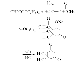 在室温下先将丙二酸二乙酯缓慢加到醇钠的乙醇溶液中且搅拌均匀,在水冷却下缓慢加入亚异丙丙酮,然后加热到50℃,维持2h,减压蒸出大部分乙醇,冷却,过滤,滤出的固体用15%的氢氧化钾溶解,恒温60℃,充分搅拌反应得5,5-二甲基-1,3-环己二酮,所得粗产品在30℃下用4mol/l的稀盐酸调节ph=4.5,滤干后可在乙醇中重结晶精制。