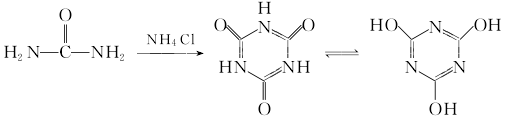 2.尿素高温热解法 以尿素为原料,经高温热解制得粗三聚氰酸,再经酸化、过滤、水洗、干燥即制得三聚氰酸成品。反应式如下: