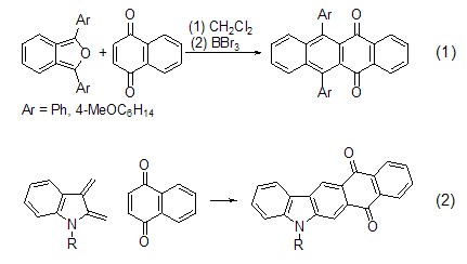 由于1-位和4-位两个羰基的吸电子效应,因此1,4-萘醌是一个非常有效的亲二烯体,能够与电负性二烯化合物发生diels-alder环加成反应,获得并多环化合物。如与并呋喃的环加成反应制备并四醌 (式1)[1],或与2,3-乙烯基吲哚反应制备并五环 (式2)[2]。