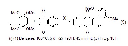 在合成具有生物活性的化合物方面,1,4-萘醌还具有非常重要的作用。如与吡咯的反应为制备抗生素提供了很好的前体 (式4)[4],与乙烯基醌缩醛的diels-alder反应则为合成非线形并多环抗生素提供了一种很好的方法 (式5)[5]。