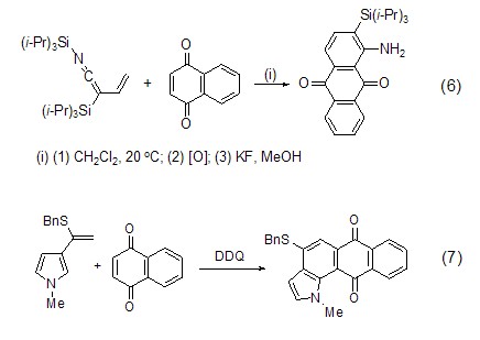 烯丙基氰化物也能与1,4-萘醌发生环加成反应 (式6)[6]。3-烯基吡咯作为二烯也能与1,4-萘醌发生反应得到吲哚化合物 (式7)[7]。