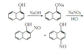 1.由1-萘酚经亚硝化而得。1.亚硝化 将氢氧化钠溶于水后,在搅拦下加入1-萘酚。过滤,滤液保持在0-5℃下,加旱灾亚硝酸钠水溶液,加完再慢慢加入。然后用1:4的稀盐酸调整ph,使刚果红试纸呈蓝色为止。用淀粉碘化钾试纸控制点,继续搅拌半小时,滤出硝化物,水洗至不呈酸性为止,干燥。2.除去异构物 亚硝化还生成4-亚硝基-1-萘酚,可用下法除去即把氢氧化钾溶于酒精后,在搅拌下慢慢加入干燥的硝化物,此时反应温度保持在60℃,加毕,继续搅拌10min。冷却,滤出粗品,加入乙醇浸泡,过滤。后精制即得成品。