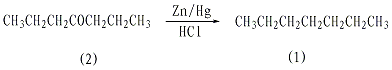 于装有搅拌器、回流冷凝器、通气导管(伸入瓶底)的反应瓶中,加入锌-汞齐100g(1.53mol),250ml浓盐酸、50ml水,搅拌下加入40g(0.35mol)庚酮-4(2),慢慢通入氯化氢气体。若反应过于剧烈,可暂停通氯化氢气体。2-3h后锌-汞齐大部分反应完,停止通氯化氢,放置过夜。撤去搅拌器等,改为水蒸汽蒸馏装置,进行水蒸气蒸馏,直至镏出液透明为止。分出上层油层,用蒸馏水洗涤二次,无水钠干燥后分镏,收集97-99℃的馏分,得到庚烷(1)26g,收率74%。注:①大部分的clemmensen还原反应的产物中含有少量的不饱和烃。加入约10%体积的浓并充分摇动,直至酸层无色或仅有很浅的黄色,分出酸层,依次用10%的饱和碳酸钠、水洗涤,无水镁或无水钠干燥,而后分馏(或减压分镏),可得到高纯度的烷烃。[26]