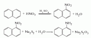 1.由1-硝基萘(见c10h7no2,[86-57-7])还原而得。原料消耗(kg/t)精萘 1116硝酸(96%) 561(92.5%) 312硫化碱(60%) 703硫磺(99%) 211