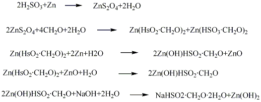 锌粉二氧化硫甲醛法用水和锌粉配成的料浆与二氧化硫气反应,生成低亚锌,然后逐步加到预先装有甲醛溶液的第二反应器中,在加热搅拌下,逐步加入锌粉于95~105℃进行反应,生成碱式次氢锌甲醛悬浮液,送入第三反应器,先用水洗涤结晶,然后静置,抽取清液,加入烧碱溶液进行反应,生成次氢钠甲醛和氢氧化锌悬浮液,经过滤,澄清滤液,浓缩、结晶、粉碎,制得次氢钠甲醛成品。