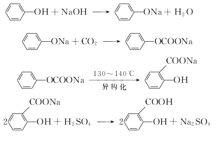 将酚与50%氢氧化钠按1:1.02(mol)配比加入反应器中进行反应脱水,控制游离碱≤1%,减压脱水后,再加酚作溶剂共沸脱水。然后将酚钠在酚中通入干燥的二氧化碳气体,进行羧化反应3h后,第二次通入二氧化碳2h,再减压回收酚,即羧化完毕。再向上述水杨酸钠溶液中,加入水溶解成50%的溶液,在搅拌下加入7%-8%的酸化至ph值1-2,然后冷却过滤,真空干燥,即得水杨酸粗品,再将粗品在减压下升华,可得含量为99%的成品水杨酸,收率50%-70%。(2)中压法 仍以酚为原料,先制成酚钠,在中压下用二氧化碳进行羧基化,生成碳酸酚酯,然后加压进行分子重排,生成水杨酸钠,再经酸化后处理制得水杨酸。