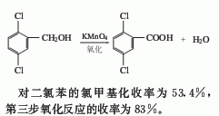 2.氯甲基化法由对二氯与多聚甲醛作用,再经高锰酸钾氧化而得。对二氯的氯甲基化收率为53.4%,第三步氧化反应的收率为83%